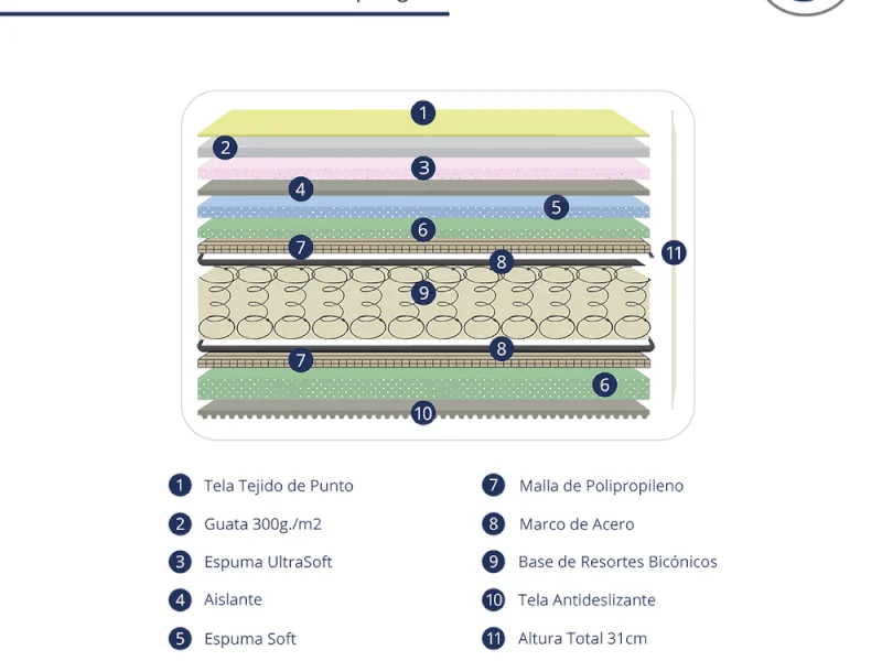 Sistema de la Estructura: Resortes bicónicos templados electrónicamente, con doble marco perimetral de acero y estabilizadores esquineros.